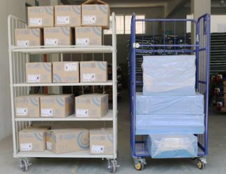 托盤搬運(yùn)車有三個(gè)車輪、兩個(gè)貨叉,而物流臺(tái)車有四個(gè)車輪,上面是由鋼筋構(gòu)件焊接成的籠子。形狀以長(zhǎng)方體為主。